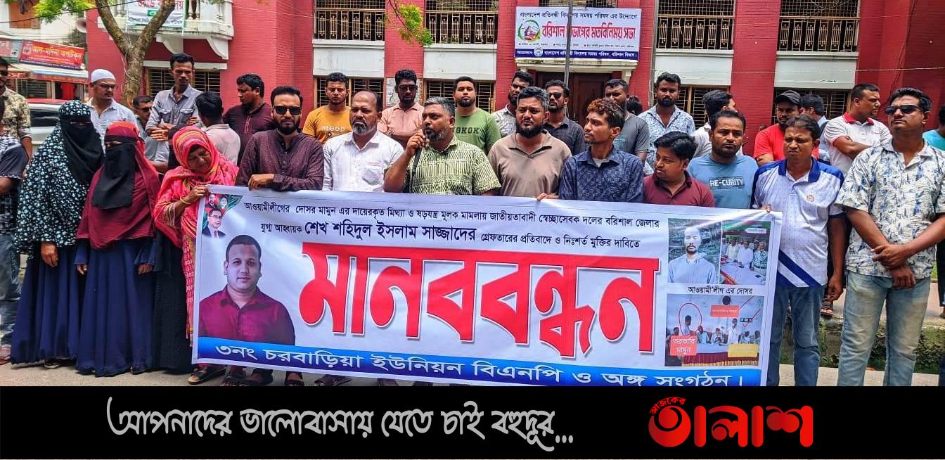 শনিবার (৯ আগস্ট) সকাল ১১টায় নগরের অশ্বিনী কুমার টাউন হলের সামনে এই মানববন্ধনের আয়োজন করা হয়। মানববন্ধনে বক্তারা অভিযোগ করেন, আওয়ামী লীগের দোসর মামুন হাওলাদার রাজনৈতিক প্রতিহিংসার অংশ হিসেবে সাজ্জাদের বিরুদ্ধে মিথ্যা ও ষড়যন্ত্রমূলক মামলা দায়ের করেছেন। তারা অবিলম্বে মামলা প্রত্যাহার ও শেখ শহিদুল ইসলাম সাজ্জাদের মুক্তি দাবি করেন।