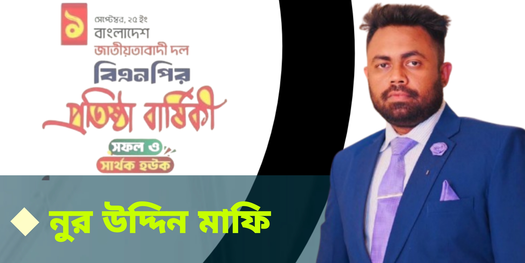 বাংলাদেশ জাতীয়তাবাদী দল (বিএনপি)-এর ৪৭তম প্রতিষ্ঠাবার্ষিকী উপলক্ষে বাংলাদেশ জাতীয়তাবাদী ছাত্রদল বরিশাল জেলা শাখার যুগ্ম সাধারণ সম্পাদক ও ডি ই এব বরিশাল জেলা শাখার সহ-সভাপতি মোঃ নুর উদ্দিন মাফি দেশবাসীসহ দলের সর্বস্তরের নেতা-কর্মীকে আন্তরিক শুভেচ্ছা ও অভিনন্দন জানিয়েছেন। এদিন তিনি শহীদ রাষ্ট্রপতি জিয়াউর রহমান বীর উত্তমের প্রতি গভীর শ্রদ্ধা জ্ঞাপন করেন এবং তাকে বাংলাদেশের আধুনিক রাষ্ট্র নির্মাণের স্থপতি হিসেবে অভিহিত করেন।