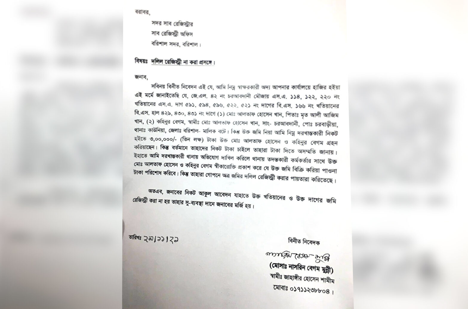 জমি রেজিষ্ট্রি না করার জন্য বরিশাল সদর সাব রেজিষ্টারের কাছে পৃথক ৩টি আবেদন জমা দিয়েছেন ৩ ভুক্তোভূগী নারী। ২৯ নভেম্বর তারা সদর সাব রেজিষ্টার অফিসে উপস্থিত হয়ে এ আবেদনটি জমা দেয়।