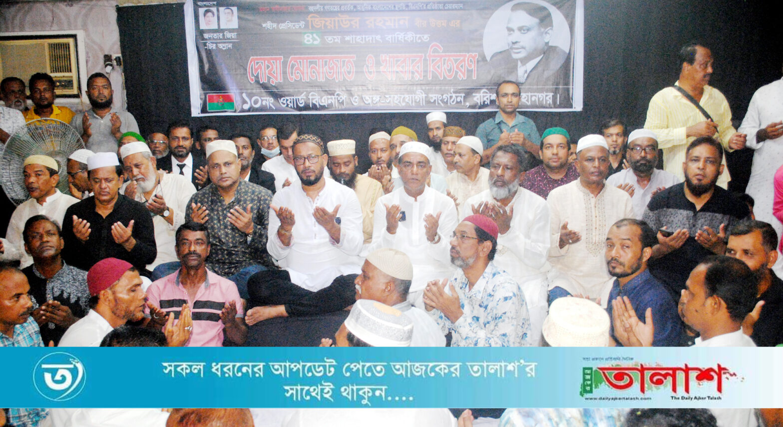 বিকালে বরিশাল মহানগর বিএনপির আয়োজনে দলীয় কার্যলয়ে আলোচনা সভা ও দোয়া- মোনাজাতের আয়োজন করা মহানগর বিএনপি বরিশালে ছয়দিন ব্যাপি বিভিন্ন কর্মসূচি পালন করার সিদ্ধান্ত গ্রহন করেছে। এছাড়া জিয়াউর রহমানের শাহাদৎ বার্ষিকী উপলক্ষে নগরীর ২৫ নং ওয়ার্ড বিএনপি নুরুজ্জামান দোলনের আয়োজনে মোবারক আলি জামে মসজিদে দোয়া-মোনাজাত ও তোবারক বিতরন করেন। এসময় উপিস্থিত ছিলেন মহানগর বিএনপি সদস্য মোঃ জসিম উদ্দিন খানসহ দলীয় নেতৃবৃন্দ।